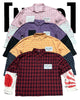 Reconstructed multi-plaid flannels featuring layered graphic sleeves and a woven “Cruel | Winter 2025” chest patch. Each piece blends grunge and streetwear with raw hem detailing and bold color palettes—Soft Pink, Purple Grid, Harvest Gold, and Crimson Red.